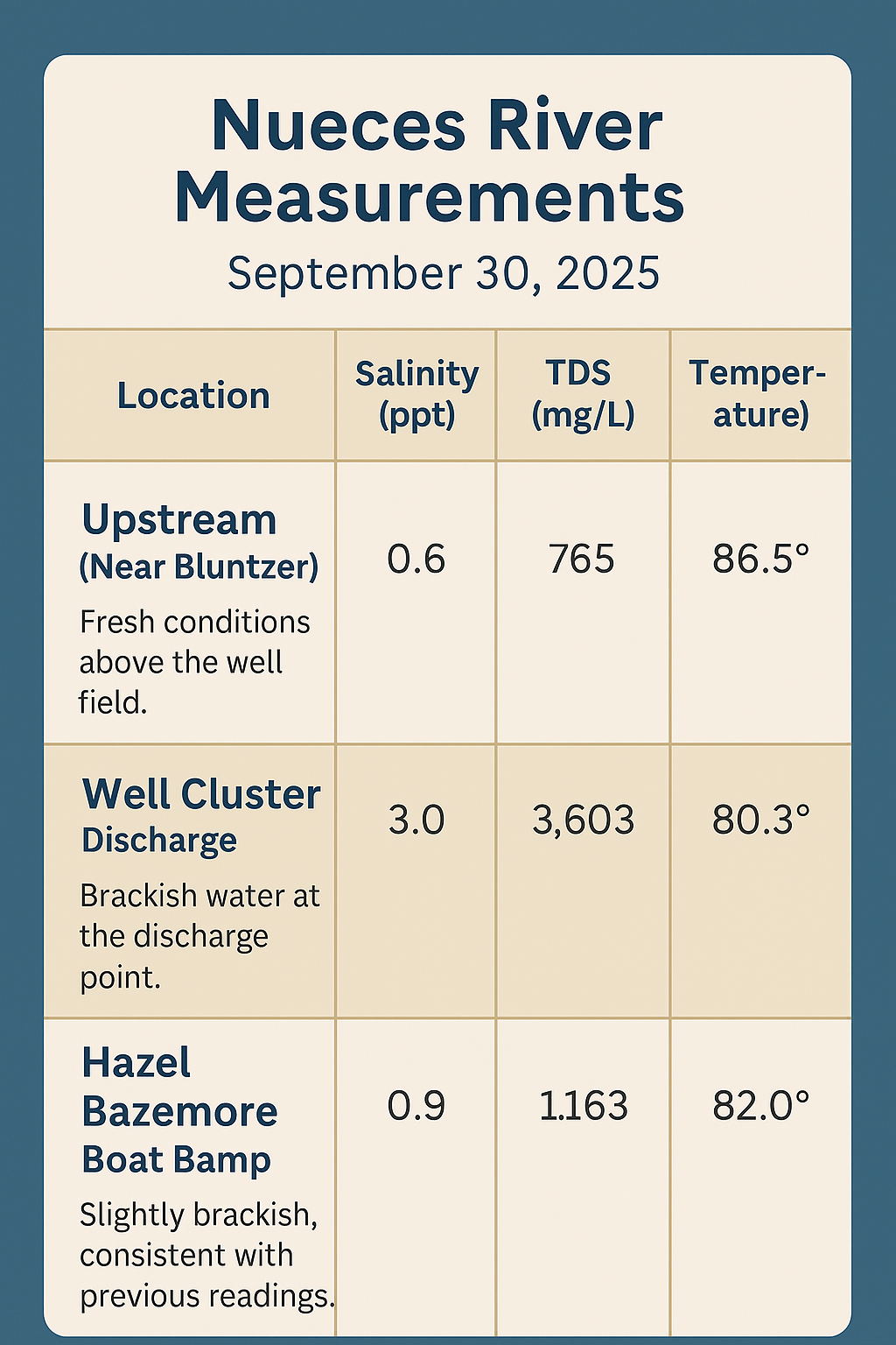 The Nueces River Basin continues to display conditions typical of a late-summer transition, where sustained heat and low rainfall influence both river and groundwater dynamics. Continued field monitoring helps document these shifts and ensure public access to current water quality and hydrologic data.