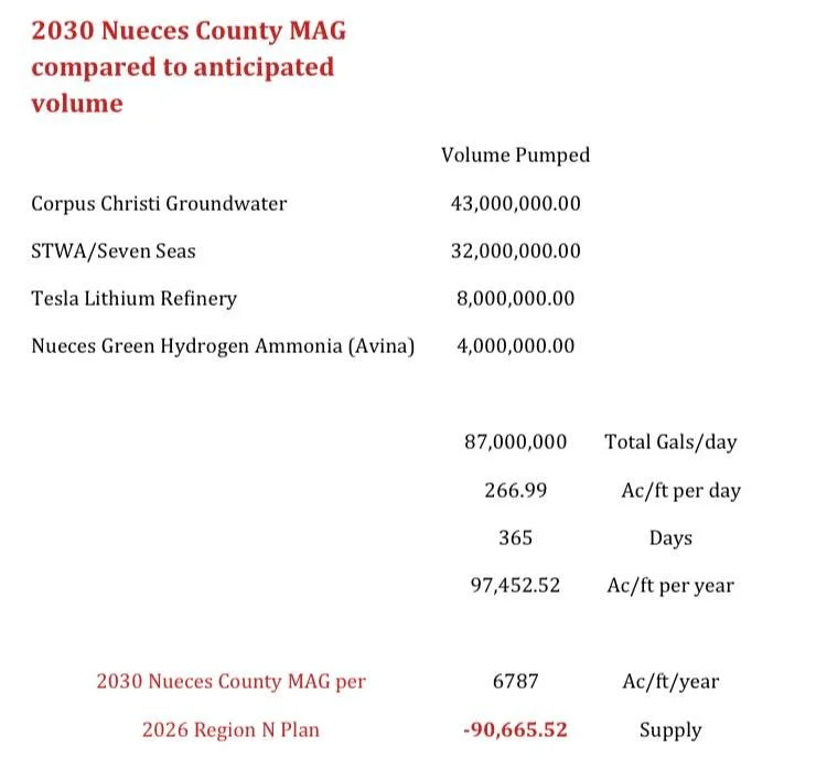 If every groundwater project currently anticipated in Nueces County were to come online at its published maximum production, the total projected demand could exceed the county’s MAG by approximately 90,000 acre-feet per year.