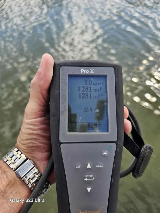 Measured water temperature was 83.5°F, typical for late summer in South Texas.