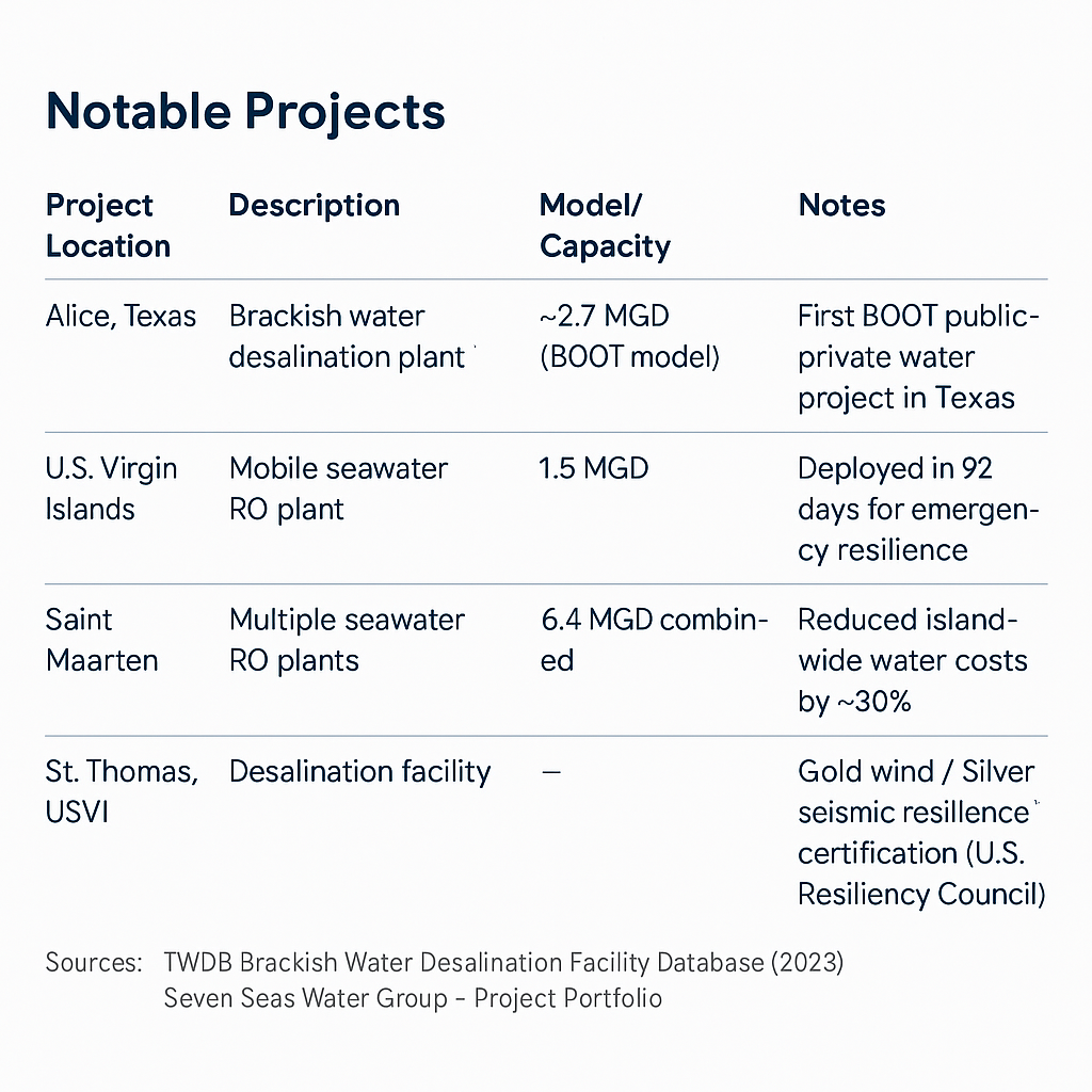 Seven Seas Water Group has previously proposed desalination-related projects in Texas, including brine disposal plans near Baffin Bay, which received public comment and community feedback during earlier environmental review processes.